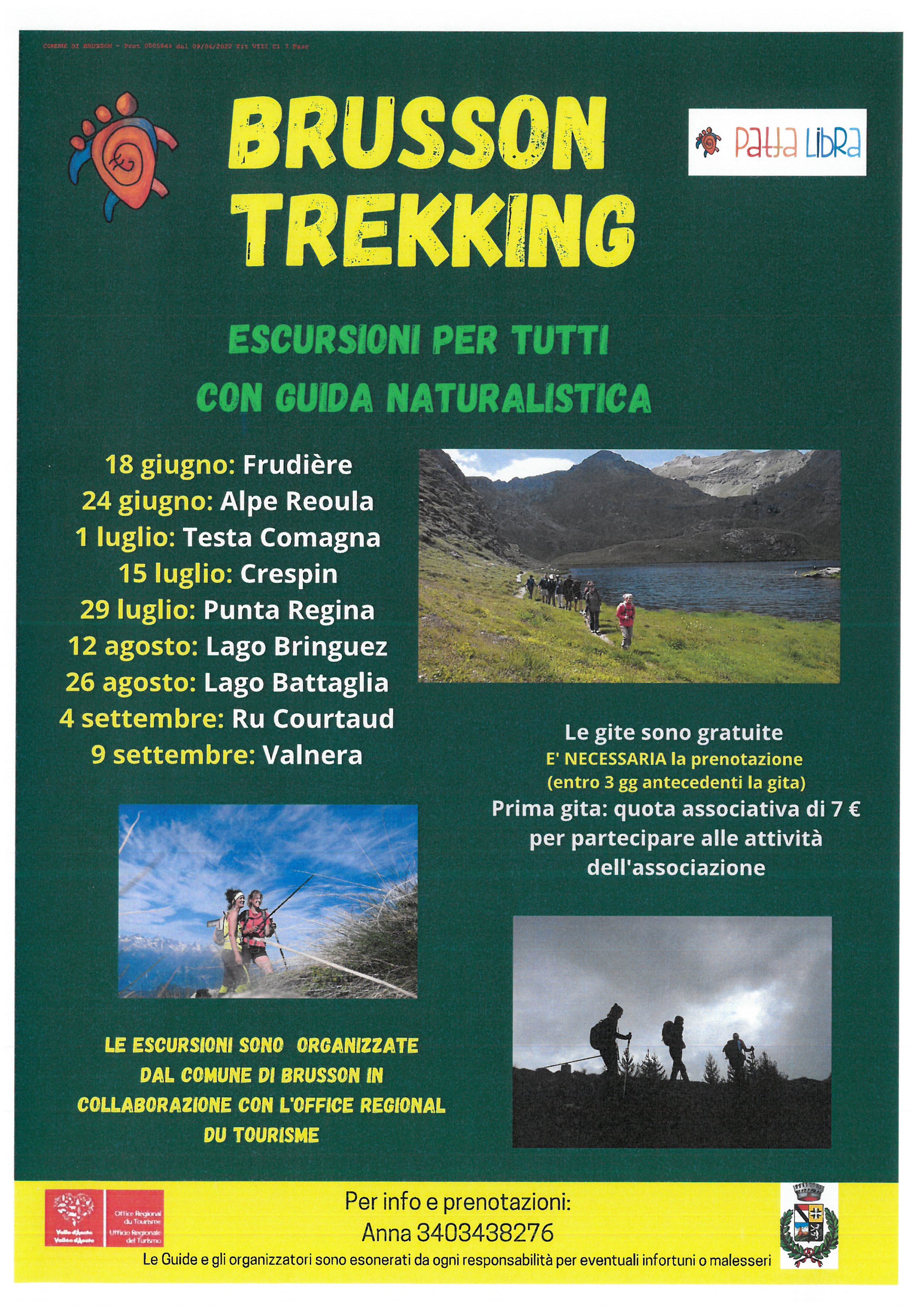 Nel quadro del progetto "Acqua, Ru e Forni in Brusson" il Comune di Brusson in collaborazione con l'Office Régional du Tourisme propone una serie di escursioni, aperte a tutti, con guida naturalistica dell'Associazione Patta Libra.