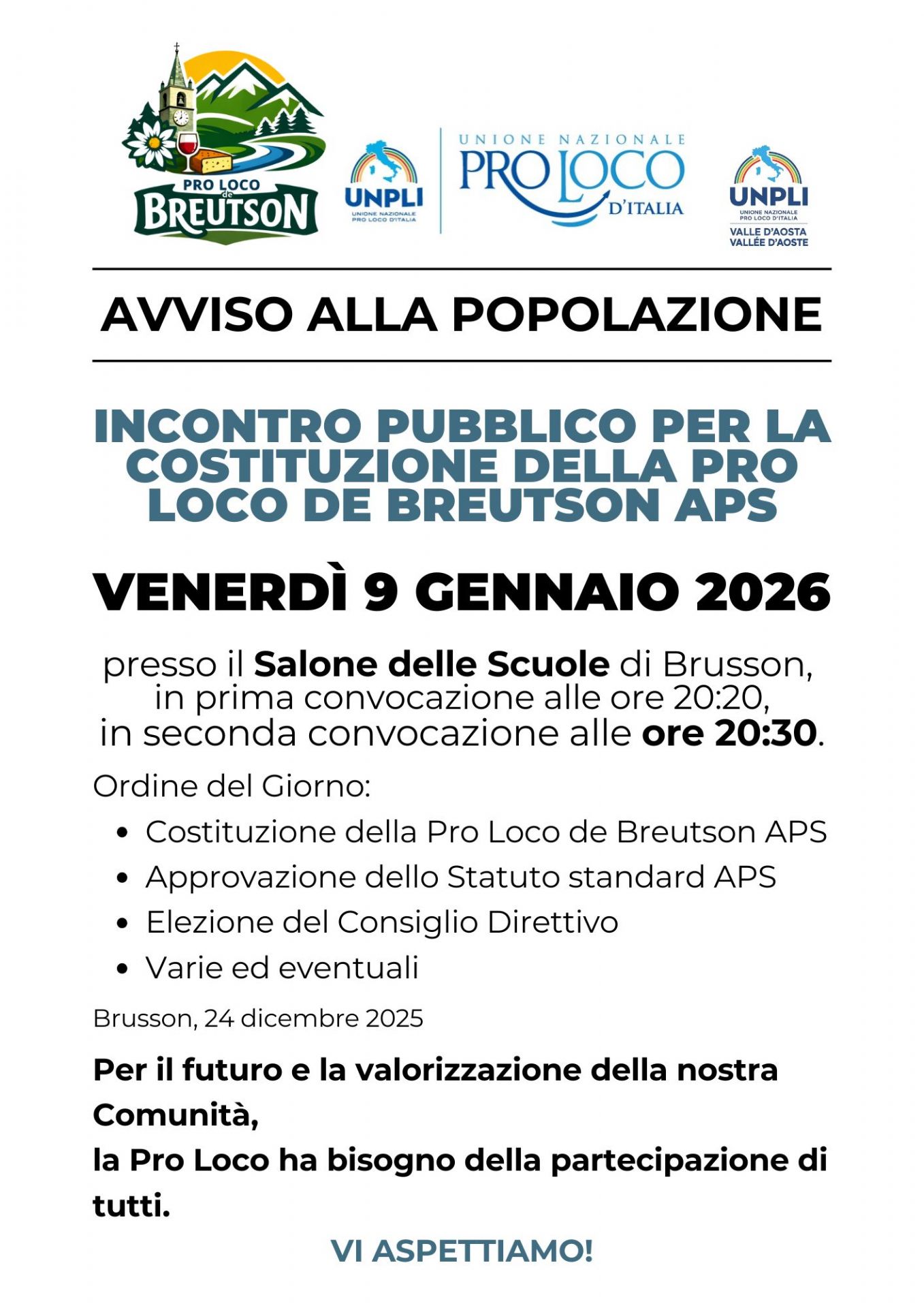 Venerdì 9 gennaio 2026 presso il Salone delle Scuole di Brusson in prima convocazione alle ore 20:20, in seconda convocazione alle ore 20:30 si terrà l'incontro pubblico per la costituzione della PRO LOCO DE BREUTSON APS con il seguente ordine del giorno: