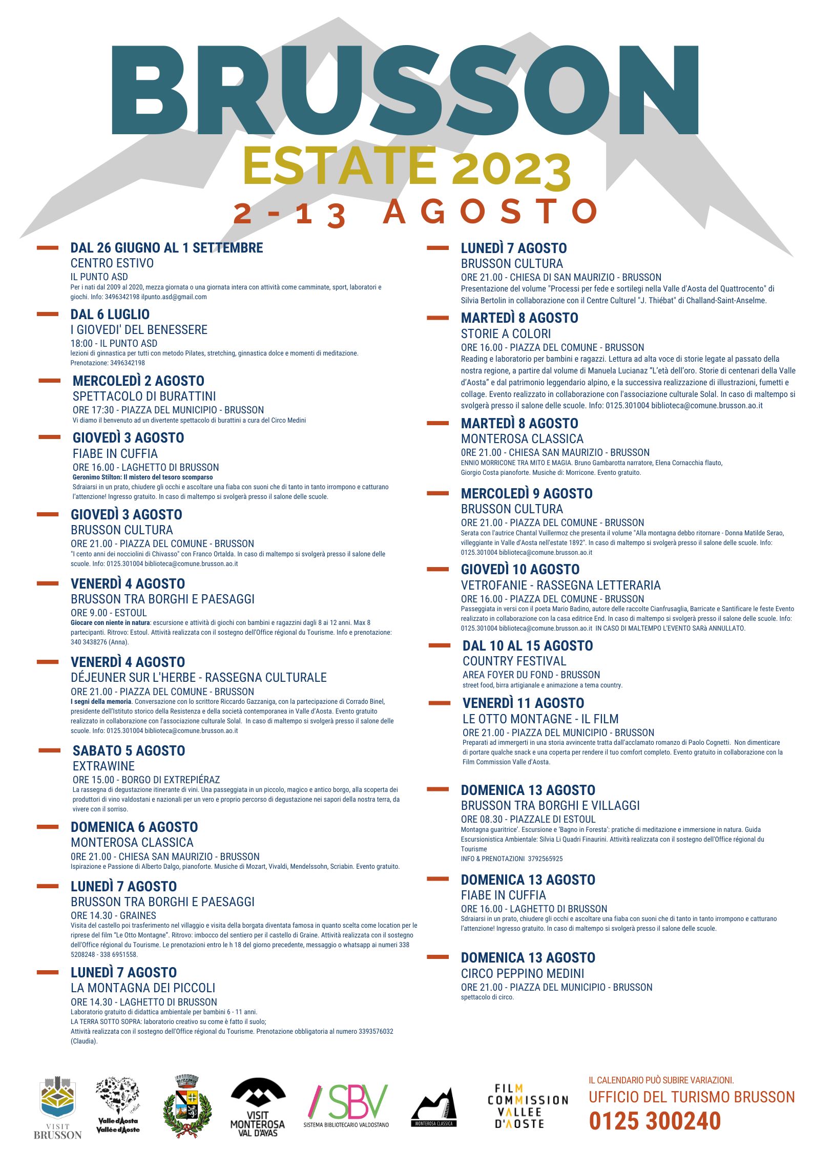 presso il salone delle scuole. Info: 0125.301004 biblioteca@comune.brusson.ao.it