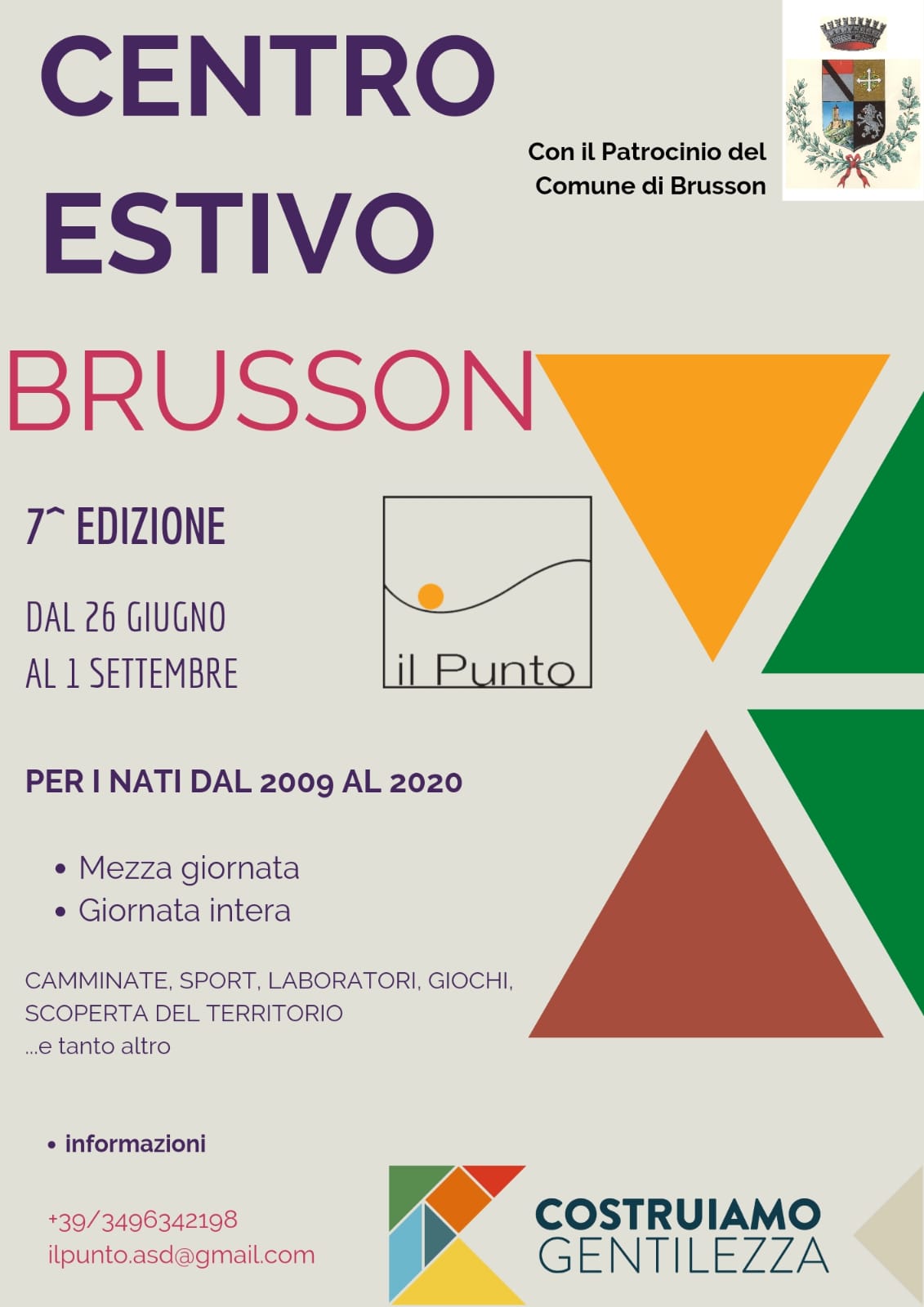 Con il patrocinio del Comune di Brusson l'ASD il punto organizza del 26.06.2023 al 01.09.2023 un centro estivo per i nati dal 2009 al 2020 con camminate, sport, giochi, scoperta del territotio e ... tanto altro.