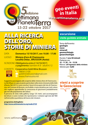 Nelle stesse giornate sarà possibile visitare la Miniera d'oro di Chamousira ed in particolare domenica 15 ottobre la coop. GOLDMINE, in occasione della 5a edizione della Settimana del Pianeta Terra, organizza delle visite guidate animate.