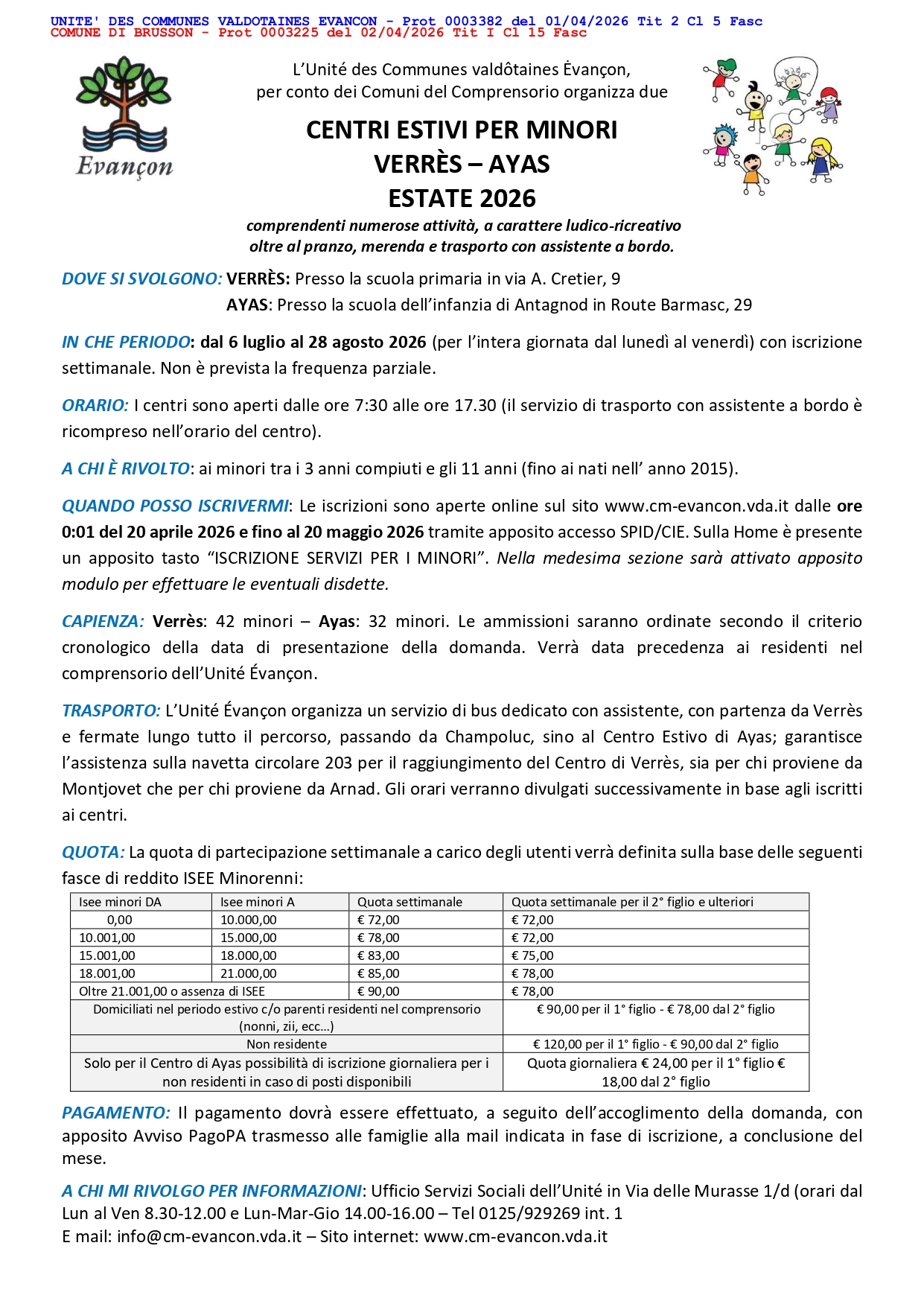 www.cm-evancon.vda.it dalle ore 0:01 del 20 aprile 2026 e fino